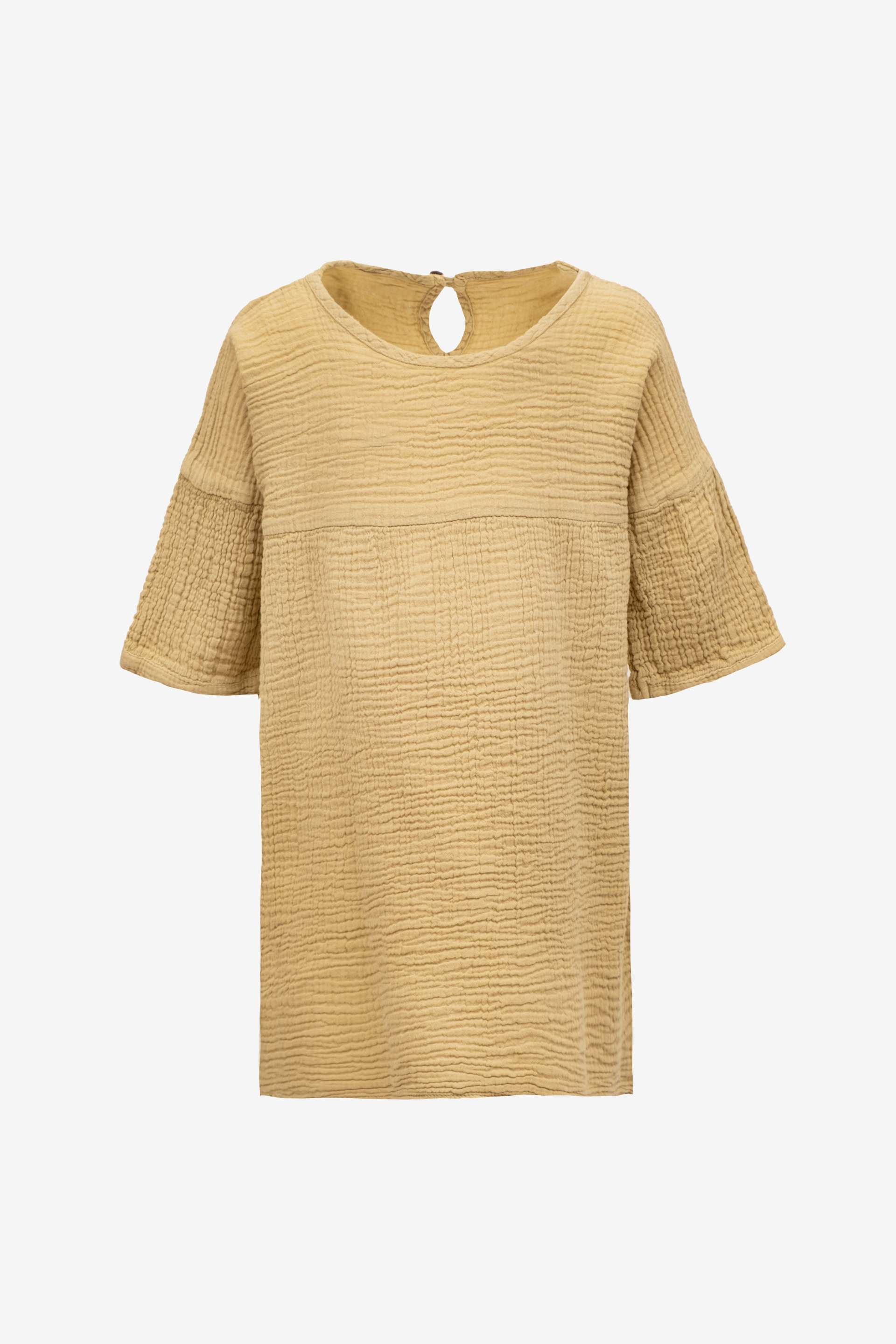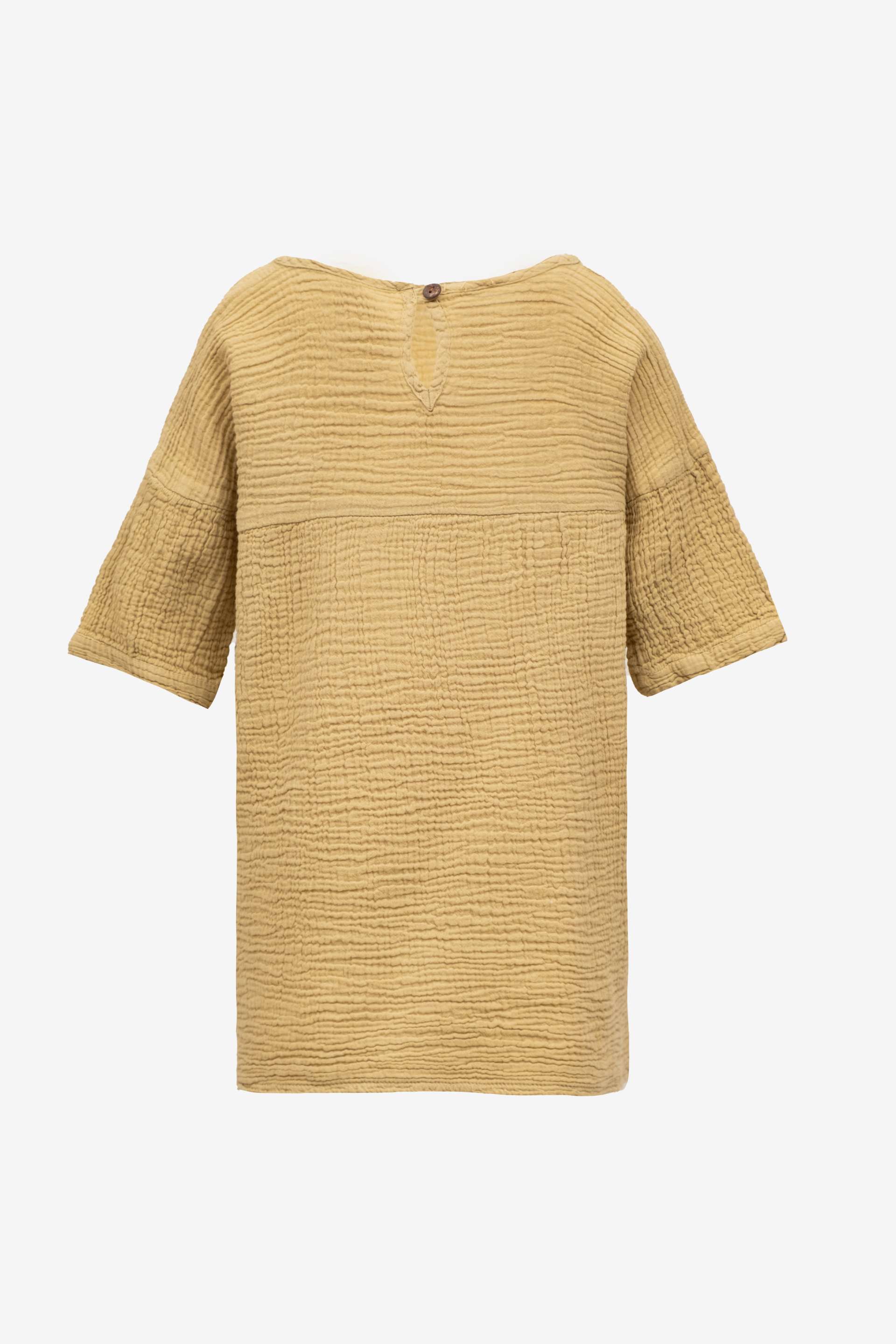 Designed with little ones' delicate skin in mind, this dress, designed with Ipekci Otantik's environmentally friendly approach, adds a pure and fresh breeze to summer days. The feather-light and breathable 100% muslin fabric gently touches the skin, providing coolness and superior comfort even in hot weather. Its elegant yoke detail, round neck design, and soft colors create a charming and stylish look. Each piece, through a special piece-dyeing and washing process, boasts unique colors inspired by nature and an exceptionally soft texture, making each dress unique. Thanks to its high-standard craftsmanship, it doesn't shrink and is long-lasting, allowing little ones to explore freely.