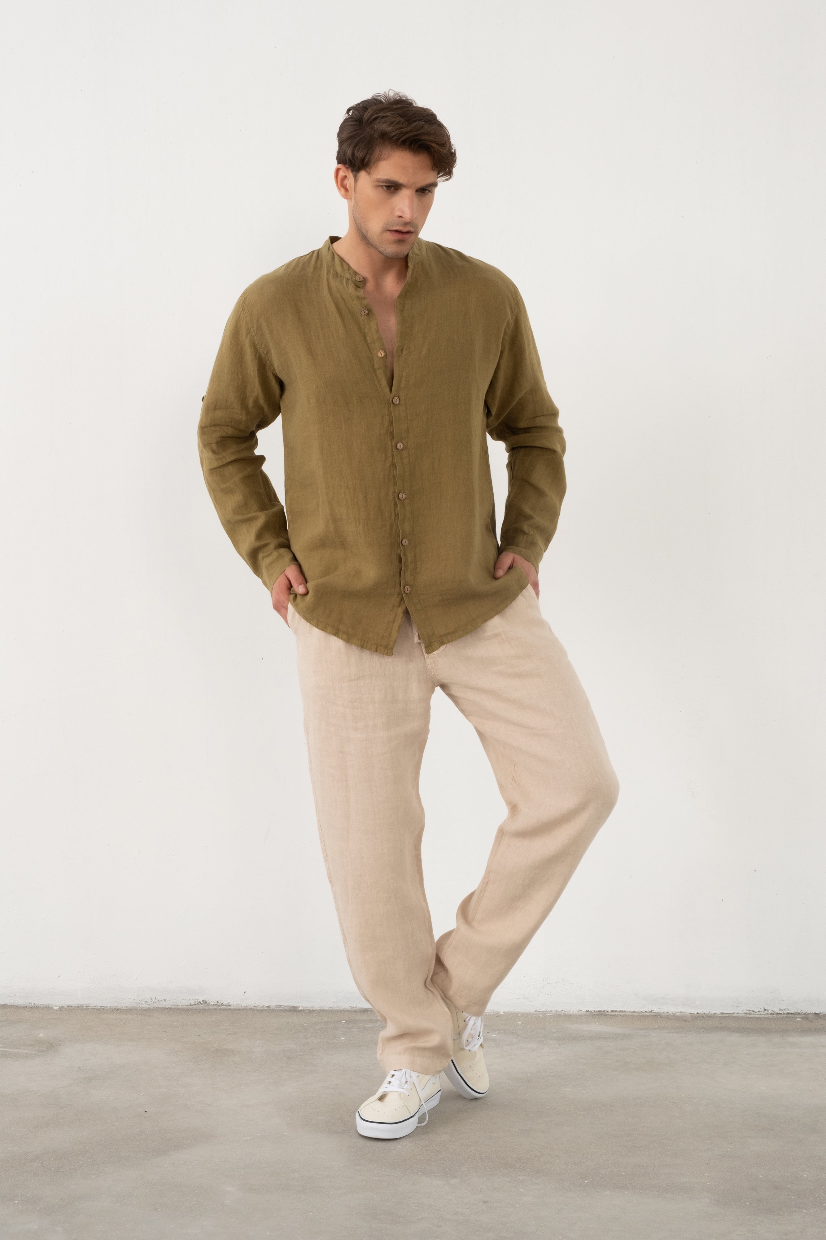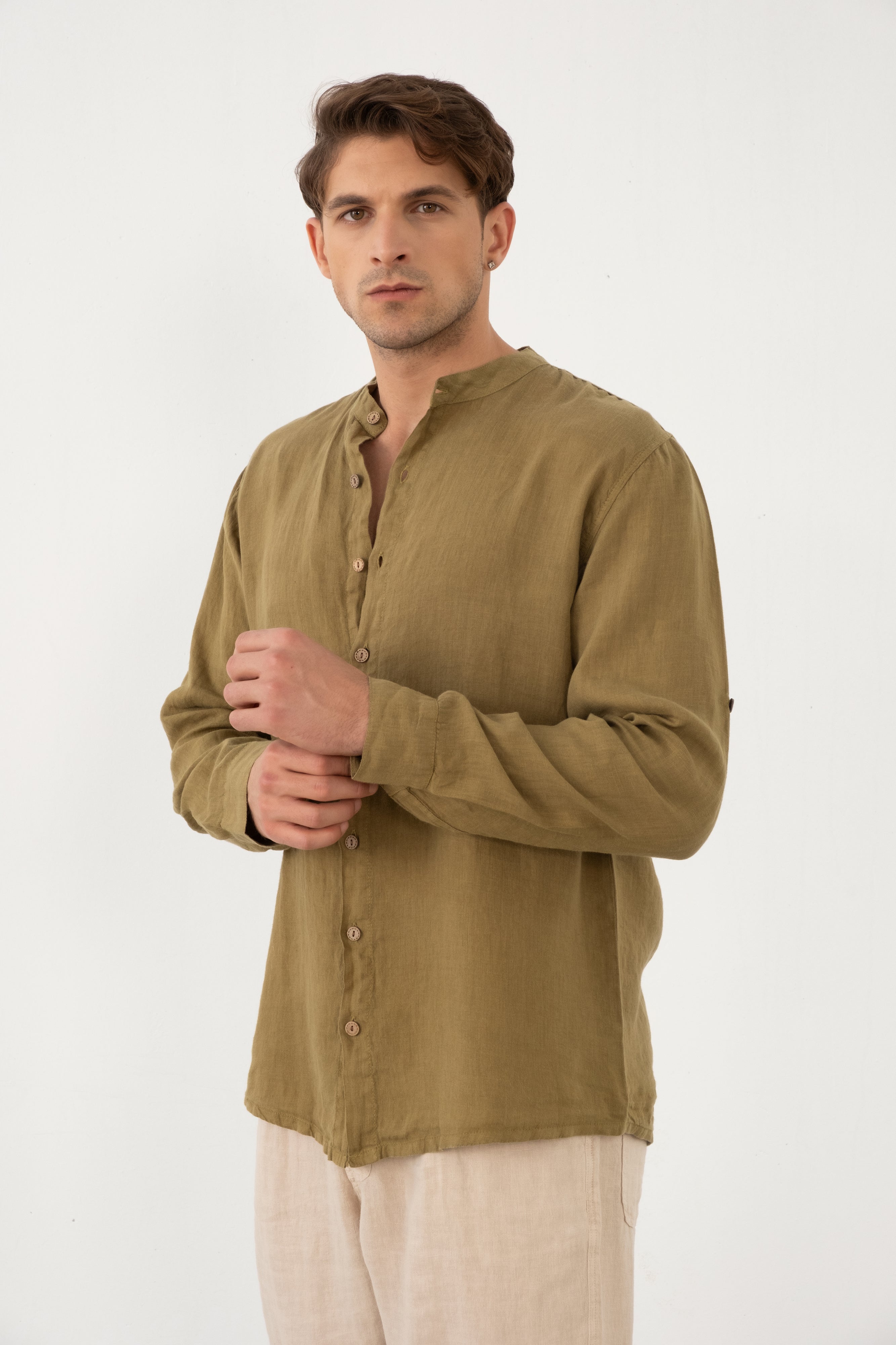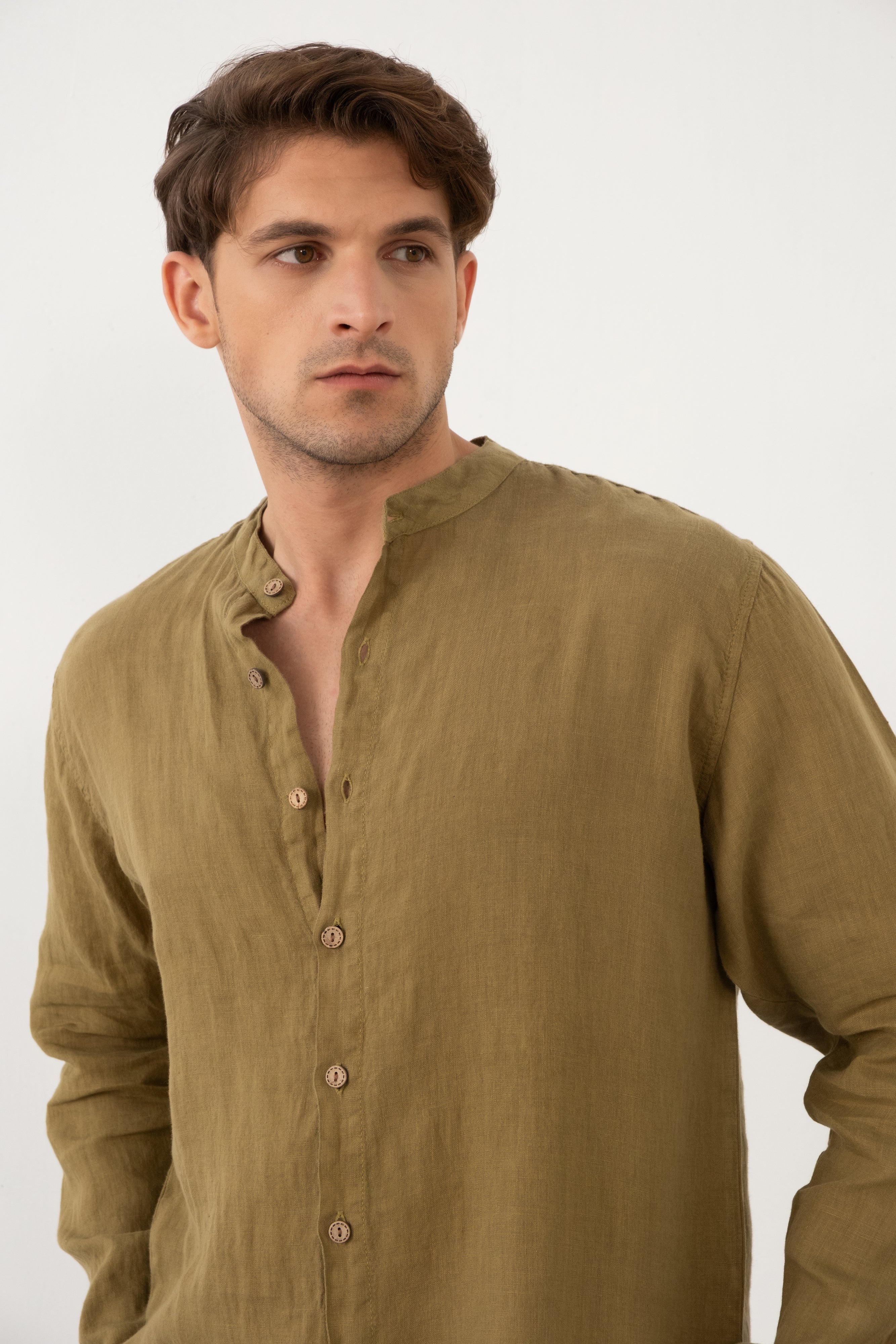 Feel the breathable, lightweight, and sweat-proof texture of 100% linen fabric, one of nature's most special gifts, on your skin with this mandarin collar shirt. Designed by Ipekci Otantik for men, this timeless piece exudes both elegance and comfort with its classic cut and modern mandarin collar. With its functional button-down design, versatile foldable sleeves, and linen fibers that soften and become more comfortable over time, this shirt is poised to become a wardrobe staple. Its unique color transitions and natural texture, achieved through a special wash process, will add an authentic touch to your style.