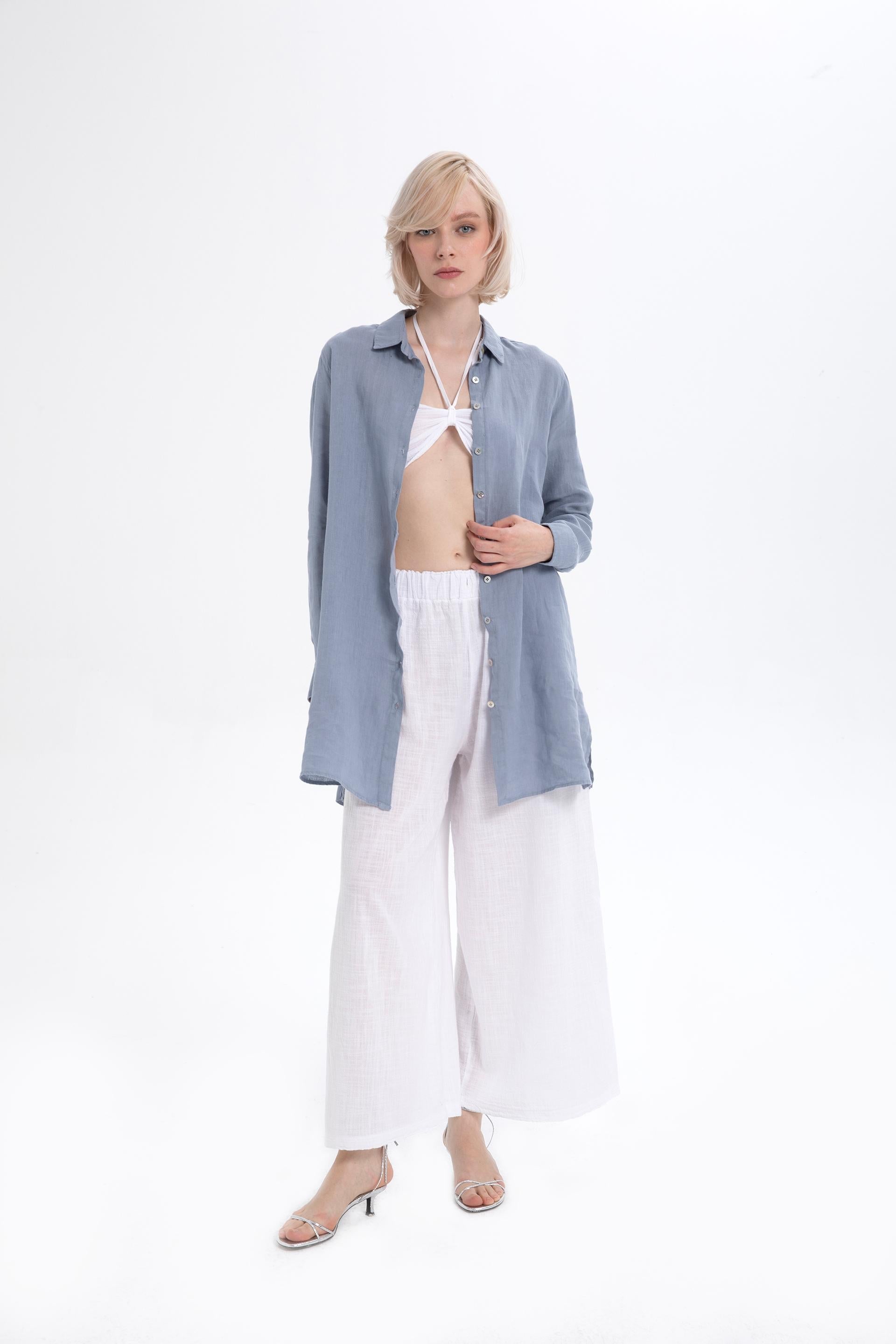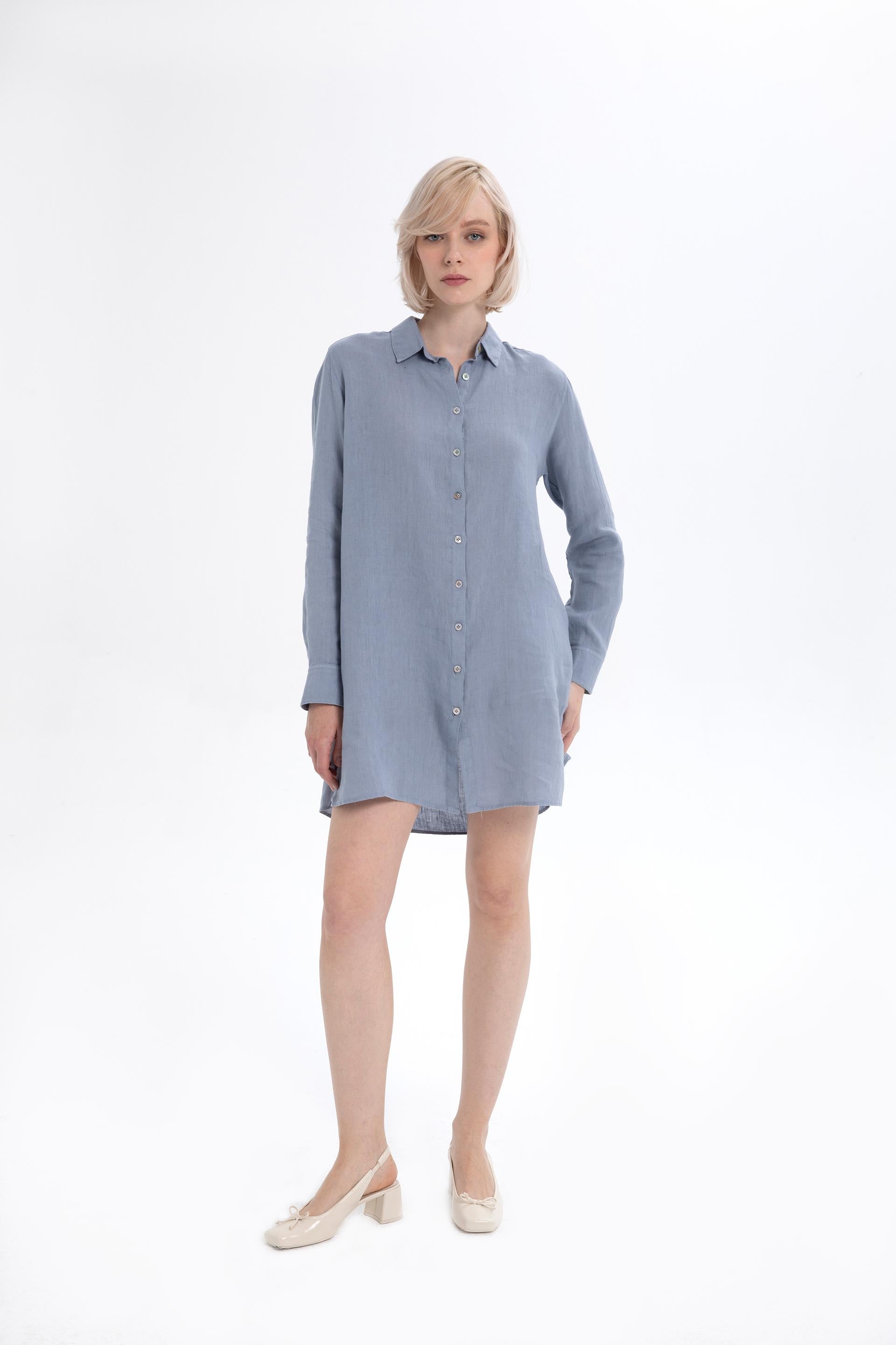A natural lightness and effortless elegance that will let your skin breathe on hot summer days... This 100% pure linen tunic dress reflects Ipekci Otantik's commitment to comfort and style, poised to become a staple in your wardrobe. The classic shirt collar and natural mother-of-pearl buttons lining the neck offer timeless elegance, while short sleeves and chic britches add a modern touch. Its oversize cut allows this flowing dress to comfortably fit any body size, and its side pockets add practicality for everyday wear.