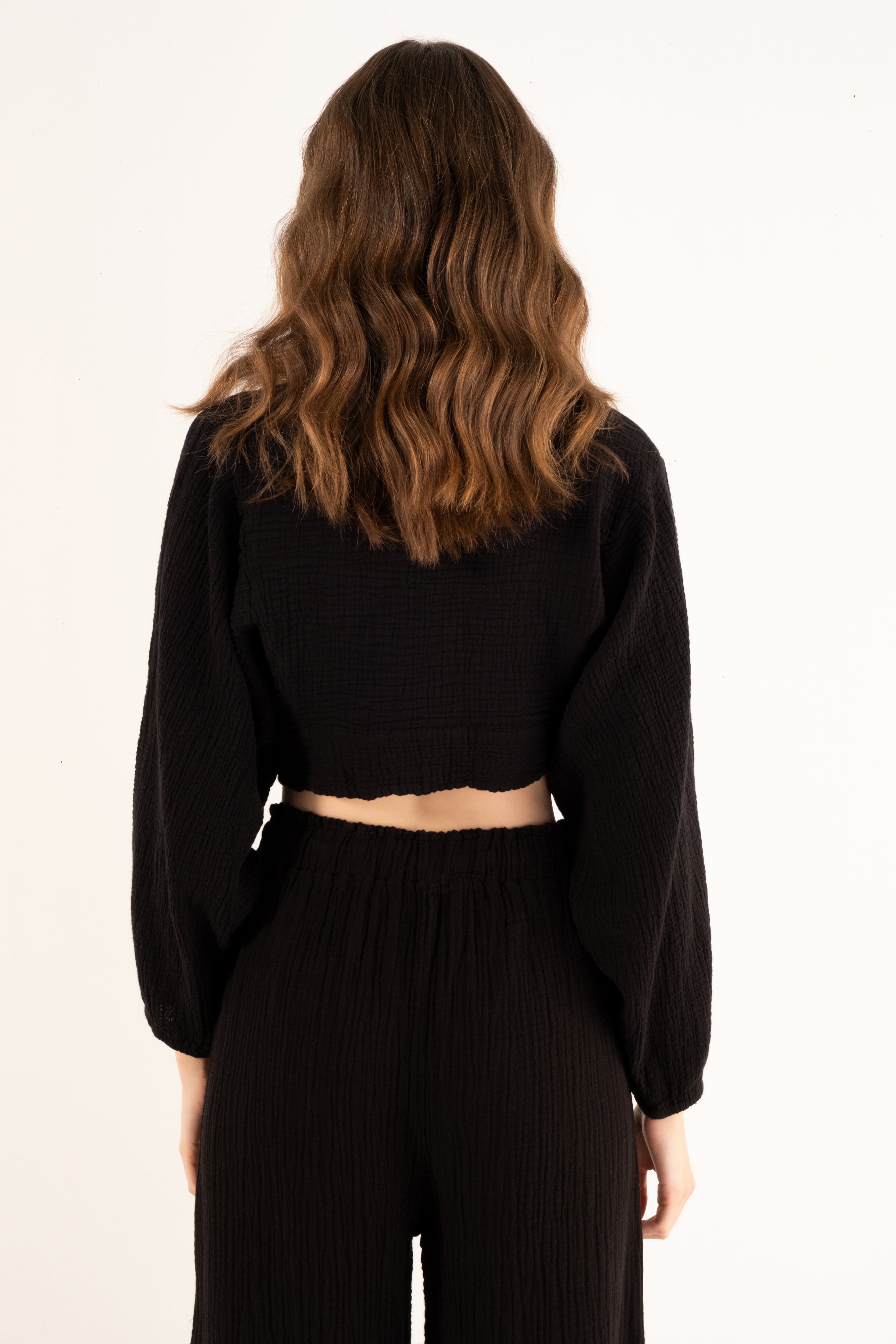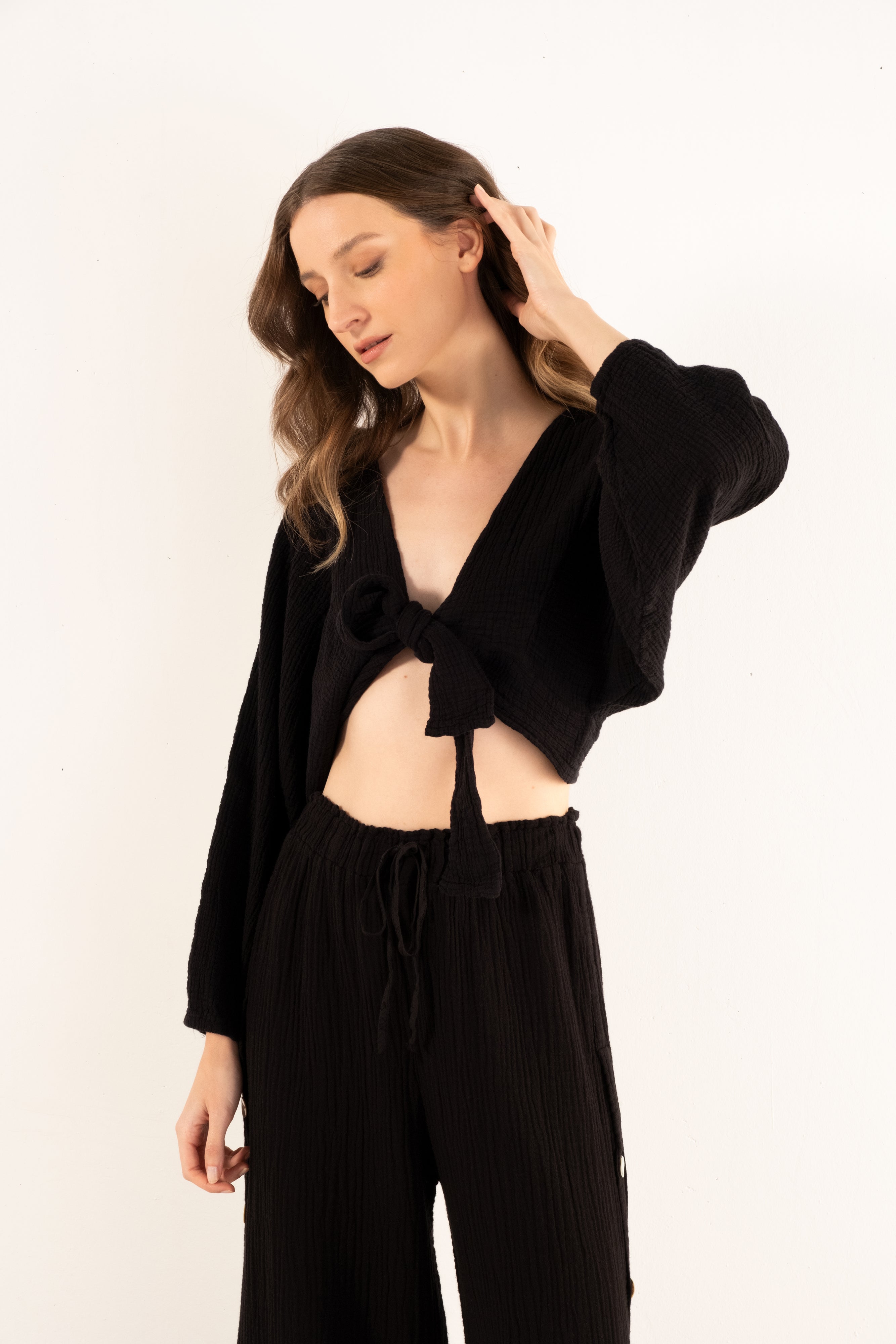 Discover the unparalleled lightness of muslin and the skin-friendly natural feel of its 100% cotton texture with this romantic blouse. Reflecting Ipekci Otantik's design philosophy, which combines elegance and comfort, this piece adds a unique touch to your style with its V-neck and customizable front tie detail. The freedom of movement offered by long balloon sleeves and the soft texture achieved through a special wash process will leave you feeling both stylish and comfortable at every turn.