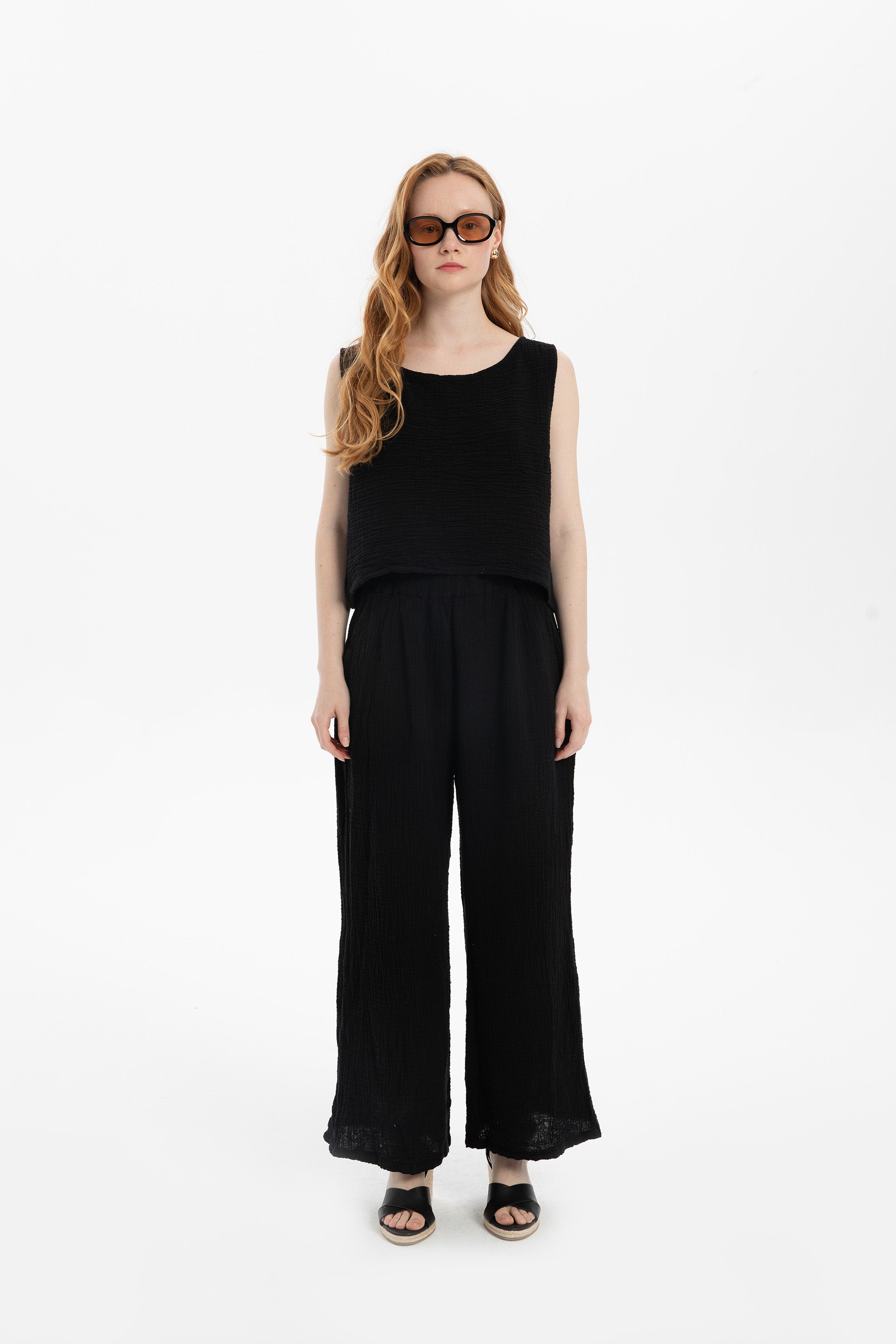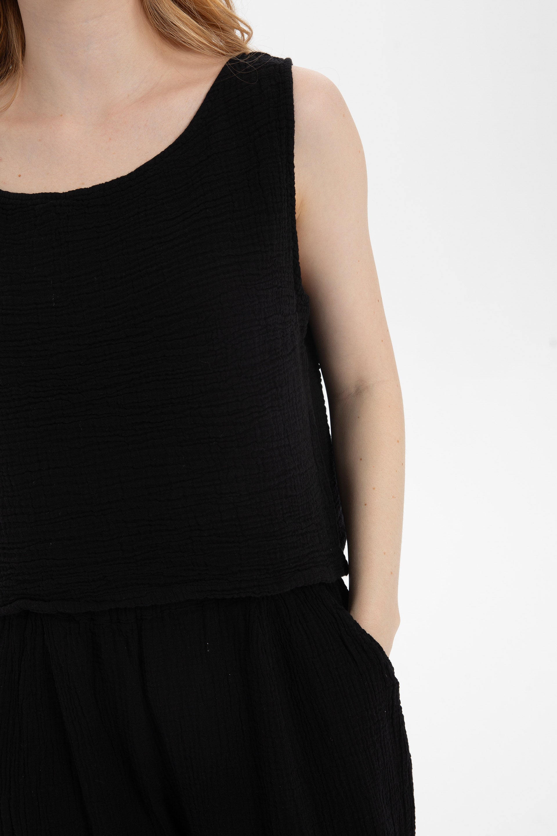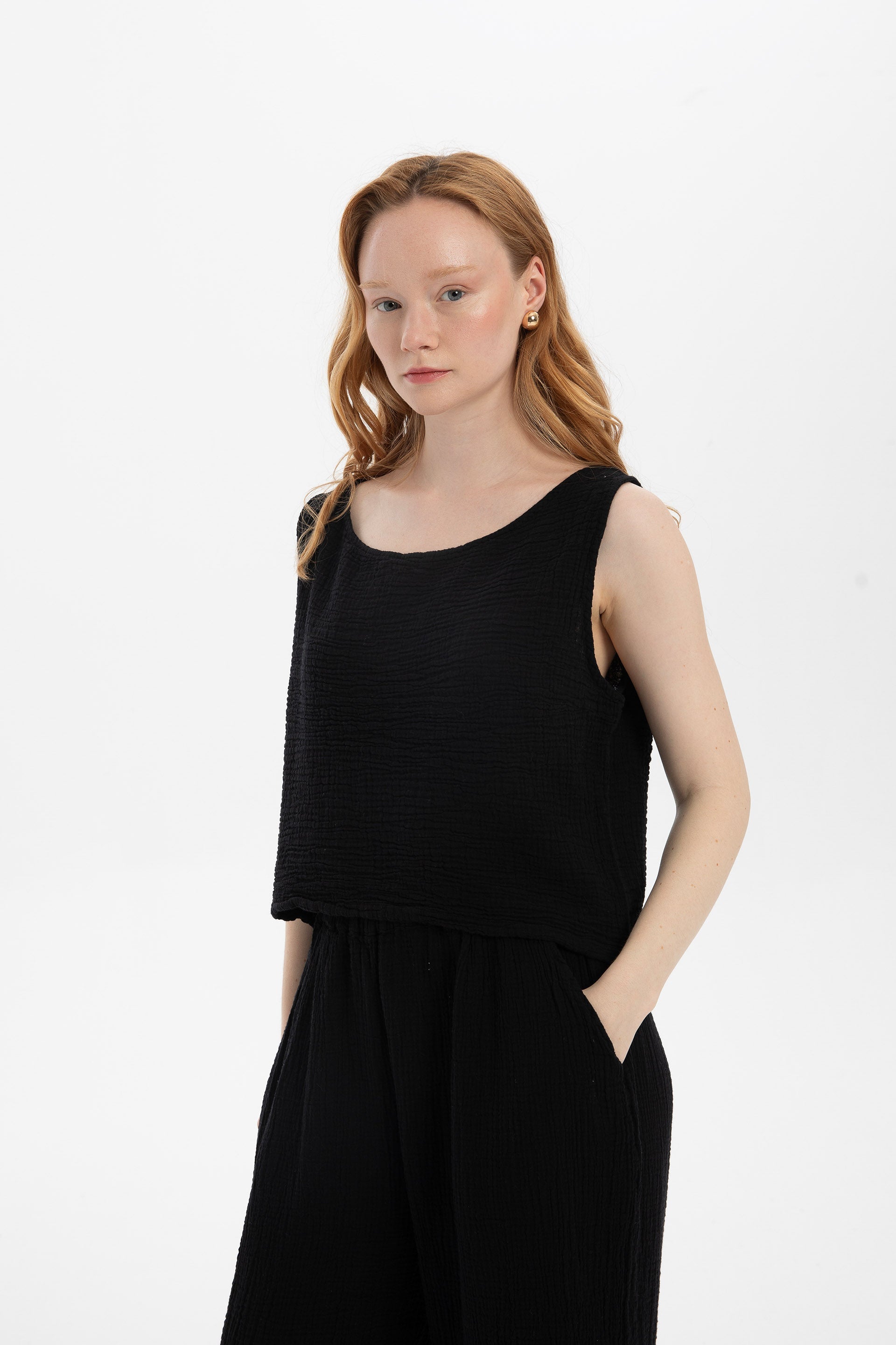 Designed with Ipekci Otantik's minimalist and timeless style, this sleeveless blouse, made of 100% muslin cotton, feels like an extension of your skin. Its wide scoop neck, sleeveless, and straight cut create a fluid and comfortable shape, while its oversized design captures effortless elegance. The natural, vintage look achieved through special piece dyeing and washing processes makes each blouse unique, adding lasting value to your wardrobe. Immerse yourself in the freshness of this nature-inspired, comfortable, and elegant design.