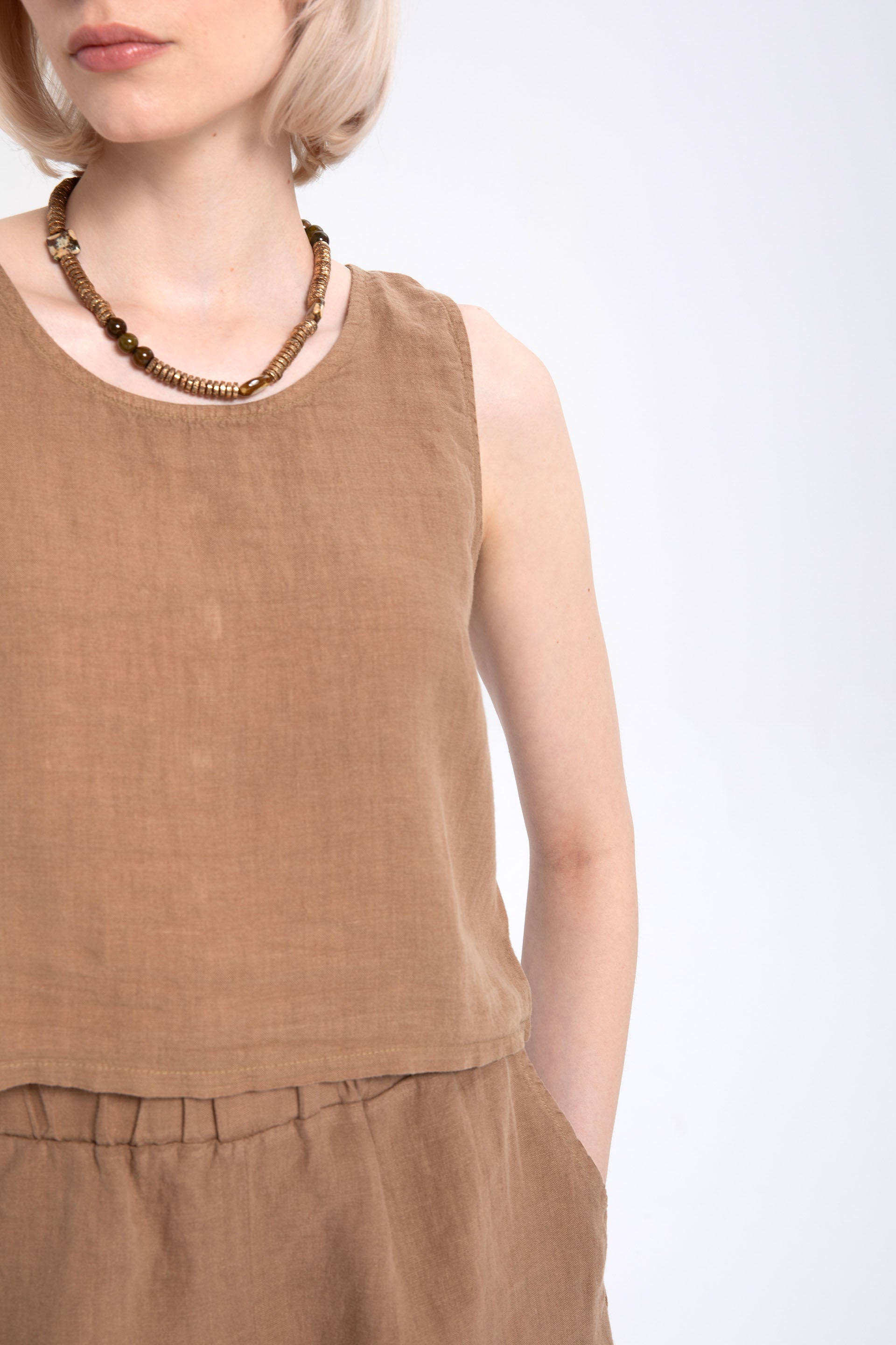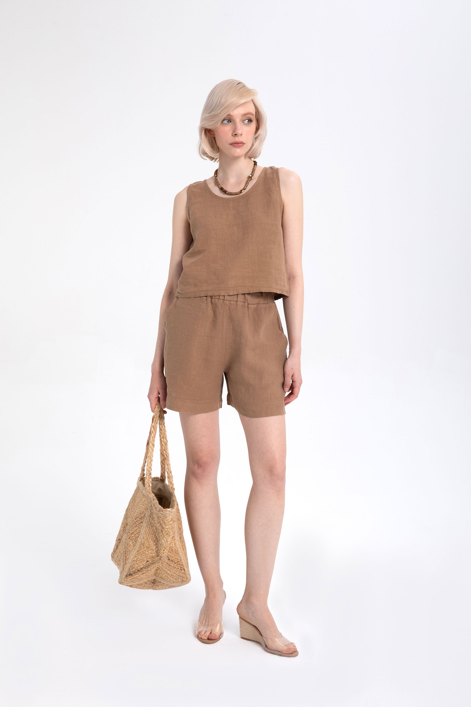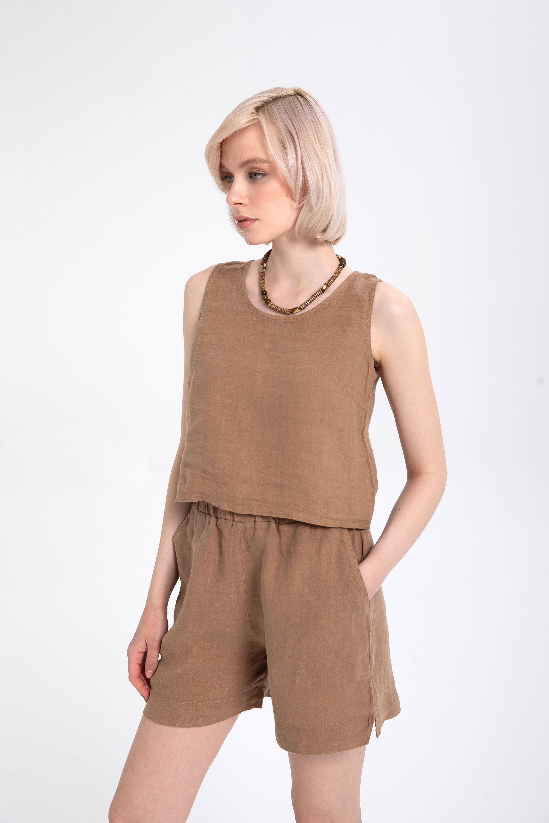 A summer staple, embrace the lightness, breathability, and unparalleled coolness of 100% pure linen. Designed with Ipekci Otantik's commitment to natural materials, timeless design, and superior comfort, this back-button crop top offers effortless elegance with its minimalist, straight cut and elegant details. Seashell mother-of-pearl buttons along the back add a vibrant, sophisticated touch inspired by nature, while the unique hues and soft texture achieved through special piece dyeing and washing processes make each piece unique. Enjoy the coolness of this natural elegance and comfort within.