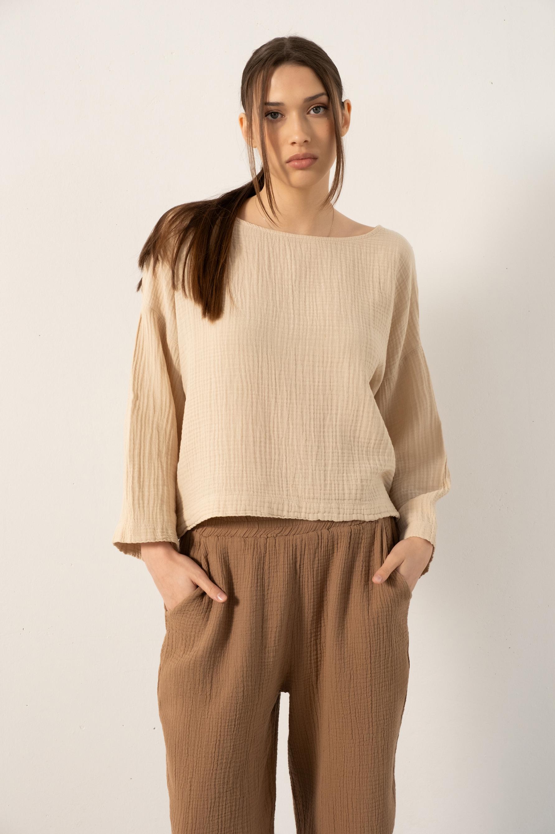 Experience the superior comfort felt through the natural and breathable texture of pure muslin cotton against your skin. Designed with Ipekci Otantik's free and timeless sense of style, this long-sleeved blouse feels like an extension of your skin, thanks to the lightness of 100% muslin cotton fabric. The wide boat neck and batwing sleeves add a fluid and comfortable form, while the oversized design captures effortless elegance. The unique colors and ultra-soft texture achieved through special piece dyeing and washing processes make each blouse unique, adding lasting value to your wardrobe. Immerse yourself in the freshness of this nature-inspired, comfortable, and elegant design.